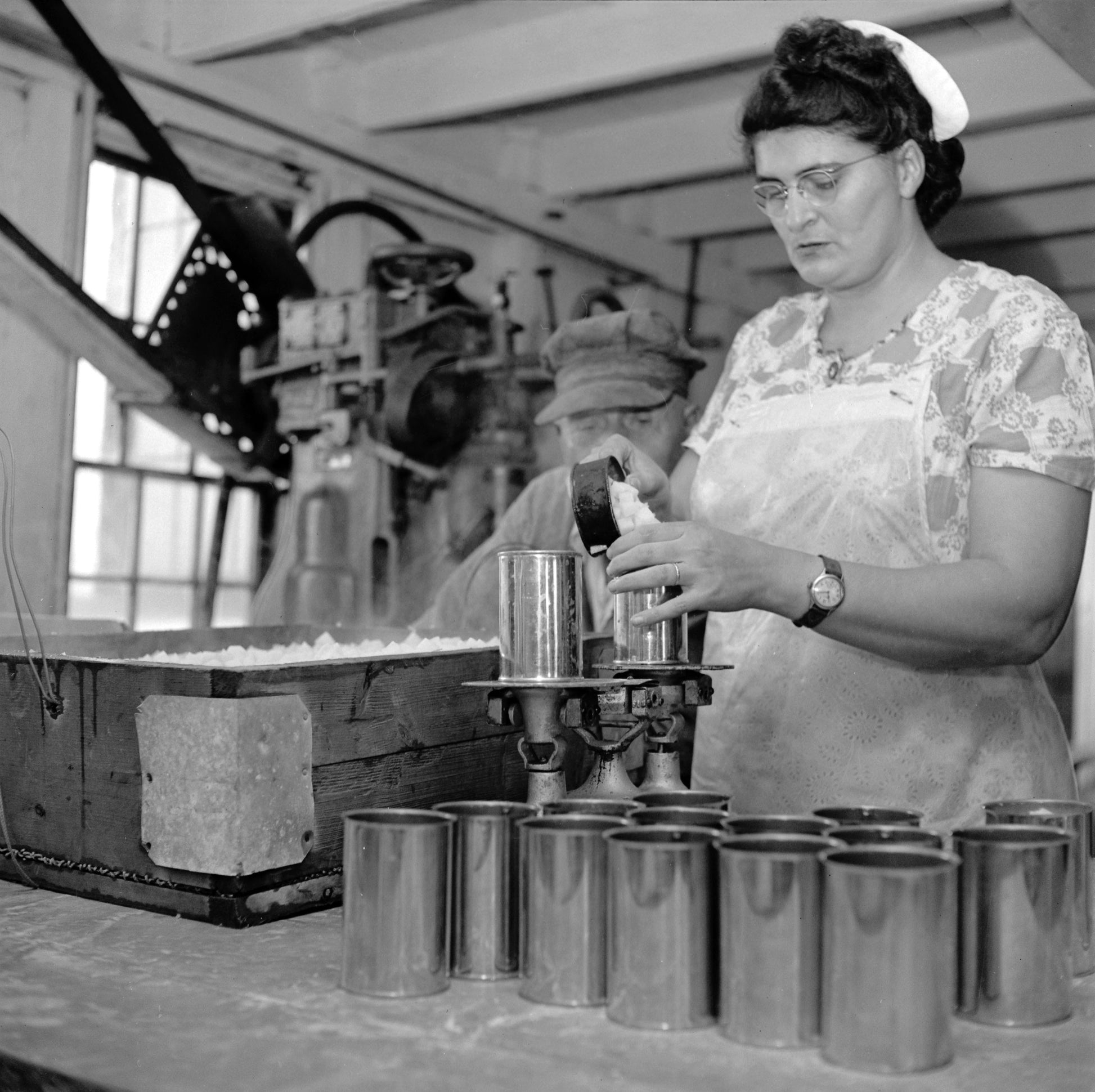 Antoinette Raymond adds diced potatoes to a can of chowder at the Frank E. Davis fish plant in New Edinburgh.