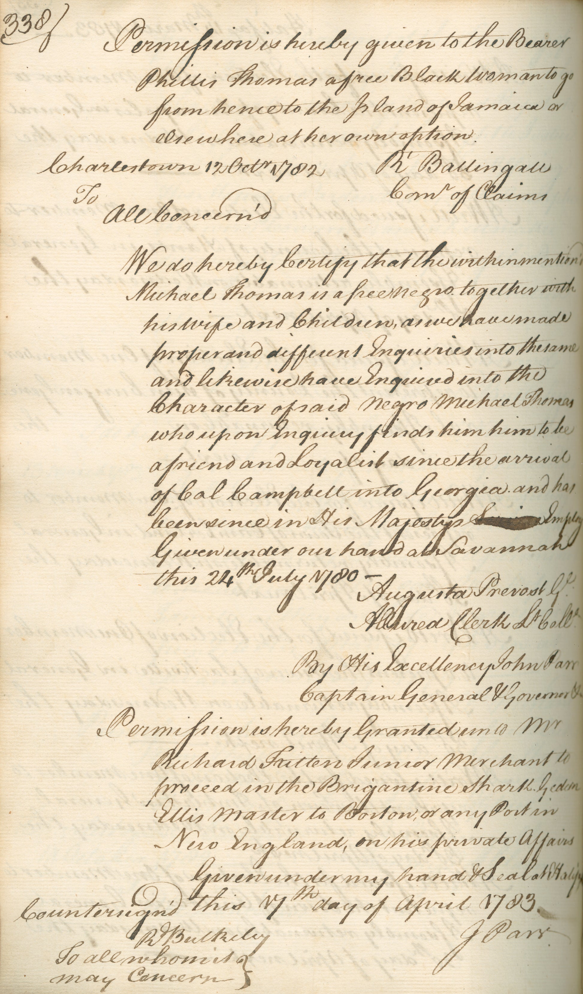 Certificate of Michael Thomas as a "free Negro together with his wife and children", 24 July 1780