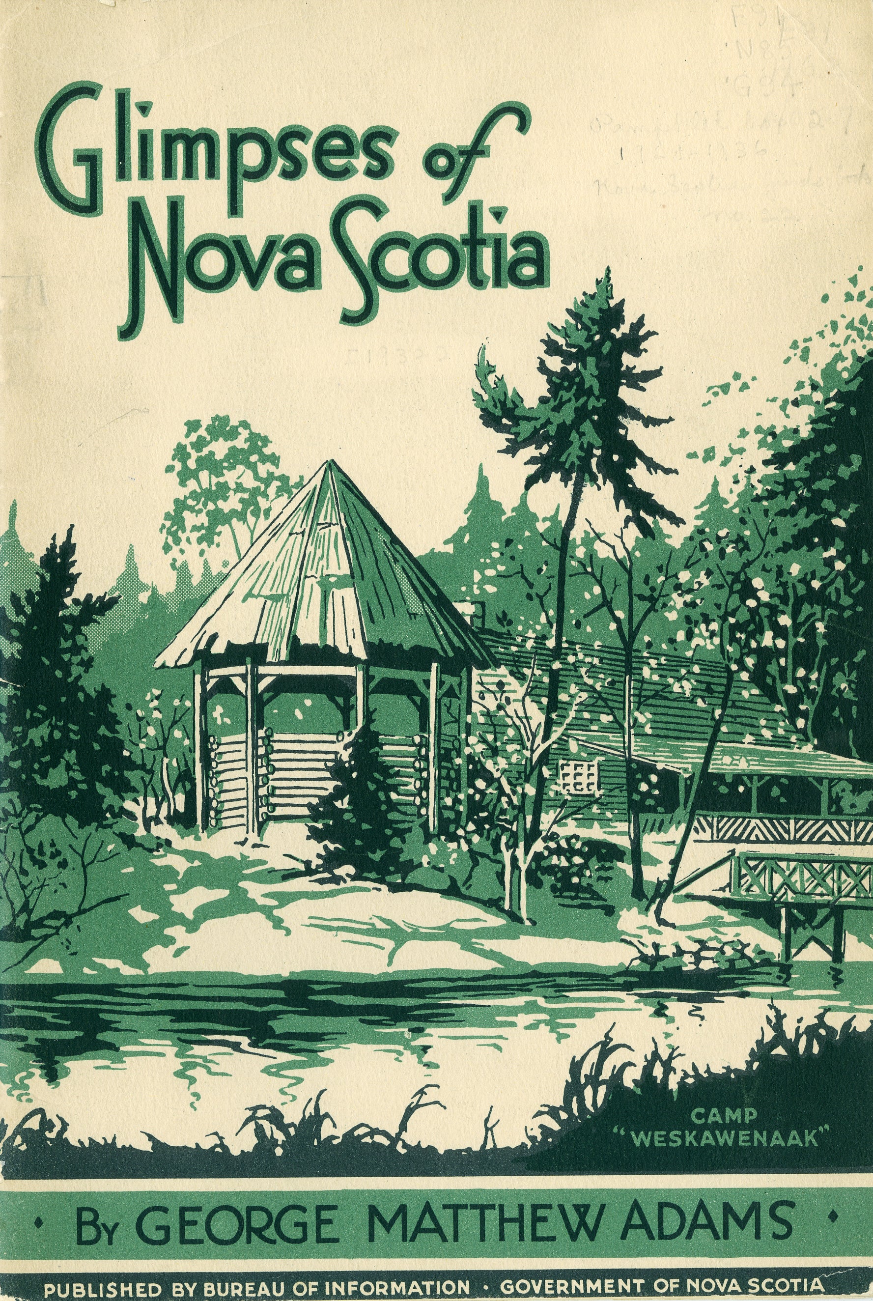 By George Matthew Adams of New York City and published by Bureau of Information, Government of Nova Scotia. Sketch on the cover is of Adams' Camp ''Weskawenaak'' at Grand Lake, Halifax County. Adams was a popular American newspaper columnist and writer of the time.