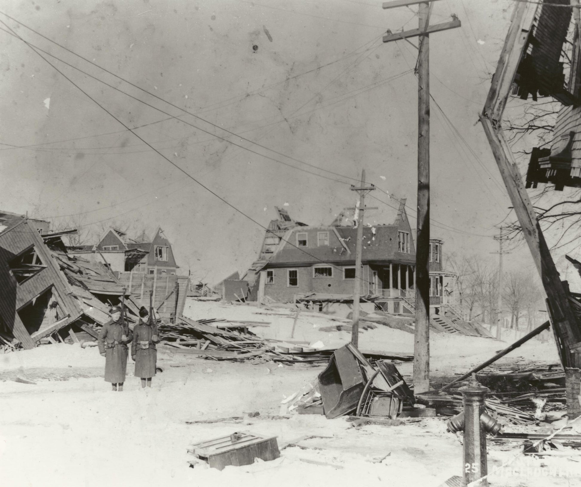 Soldiers standing guard in the midst of the devastation on Kaye Street east of Gottingen Street, Halifax