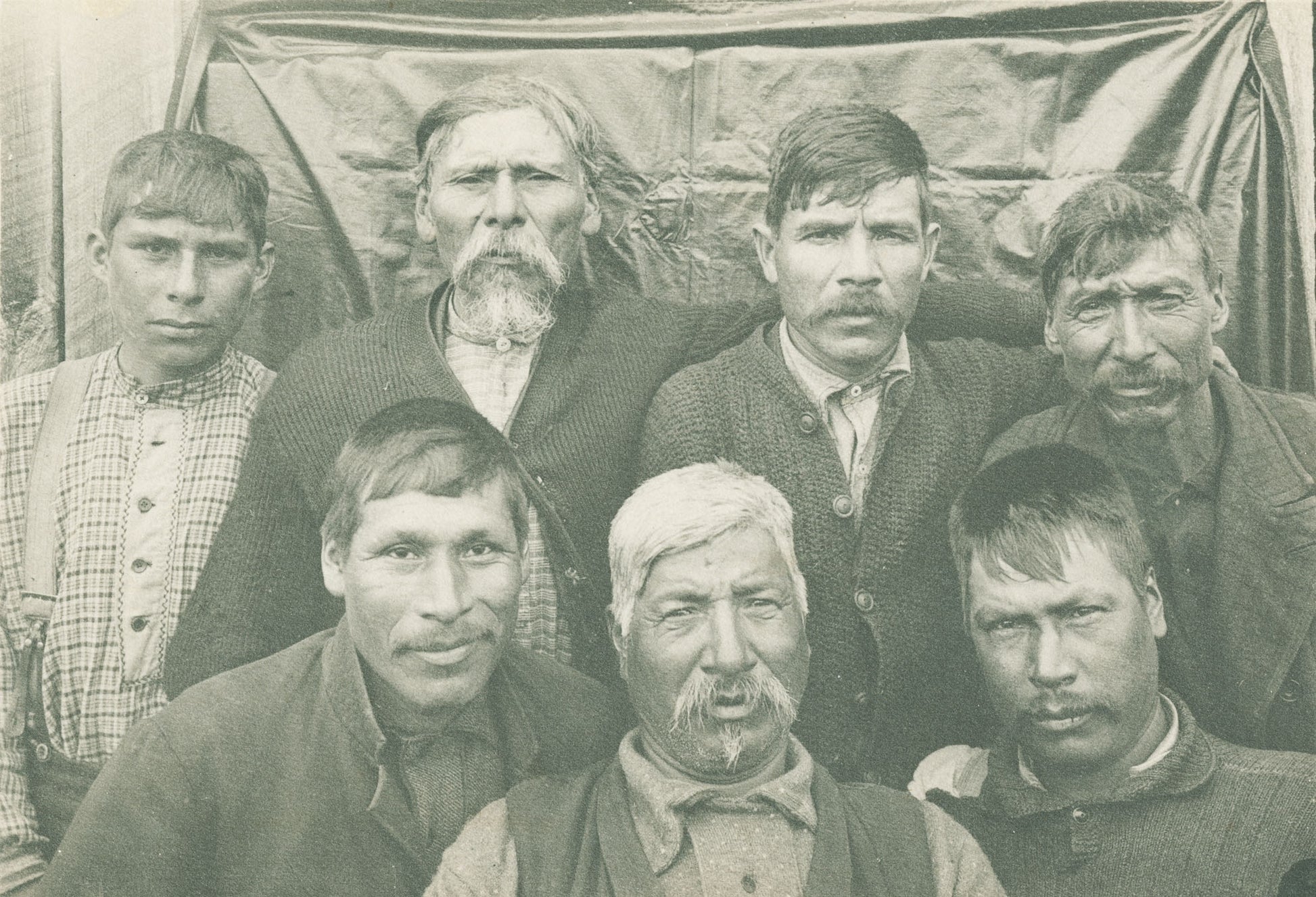Attributed to J.A. Irvine. Left to right, top row: "Louis Peters, John Peters, John McEwen, John Louis." Left to right, bottom row: "John Labrador, Malti Pictou - Ex-Chief, Eli Pictou." [Mi'kmaq Portraits Collection, NSM: The man identified as 'Malti Pictou' in this image is actually Simeon Pictou, Malti's brother.]