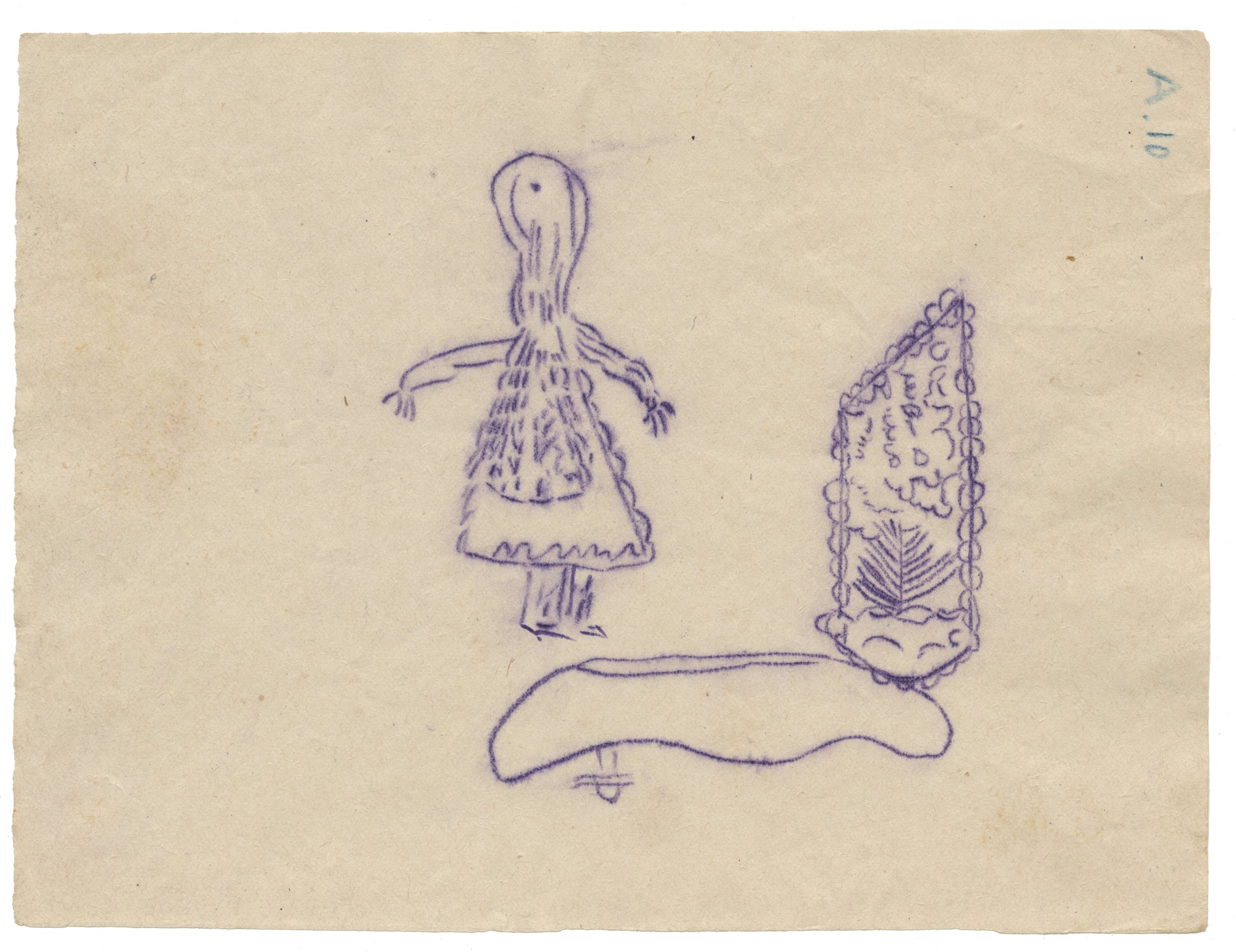 Petroglyph tracings A: [Peaked 4 sided figures] #10. 2 negatives and 2 positives. Possibly a woman. Beneath the cap and figure appears to be an inverted Mi'kmaq canoe with a person seated at the back.