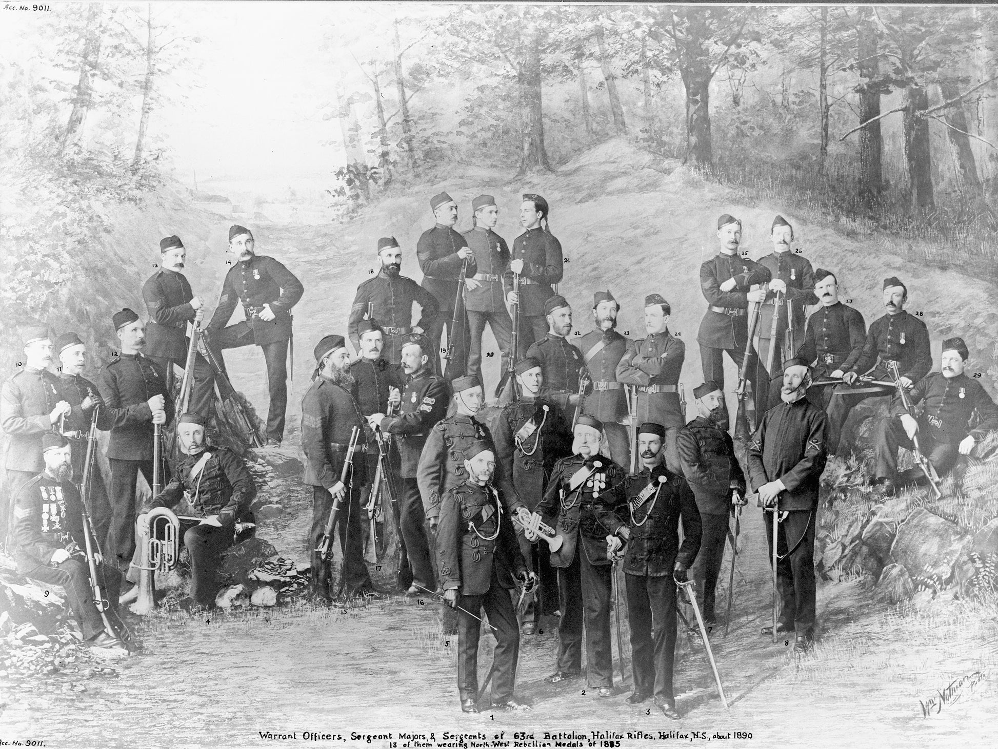"Warrant Officers, Sergeant Majors & Sergeants of 63rd Battalion, Halifax Rifles, Halifax, N.S., about 1890. 13 of them wearing North-West Rebellion Medals of 1885"