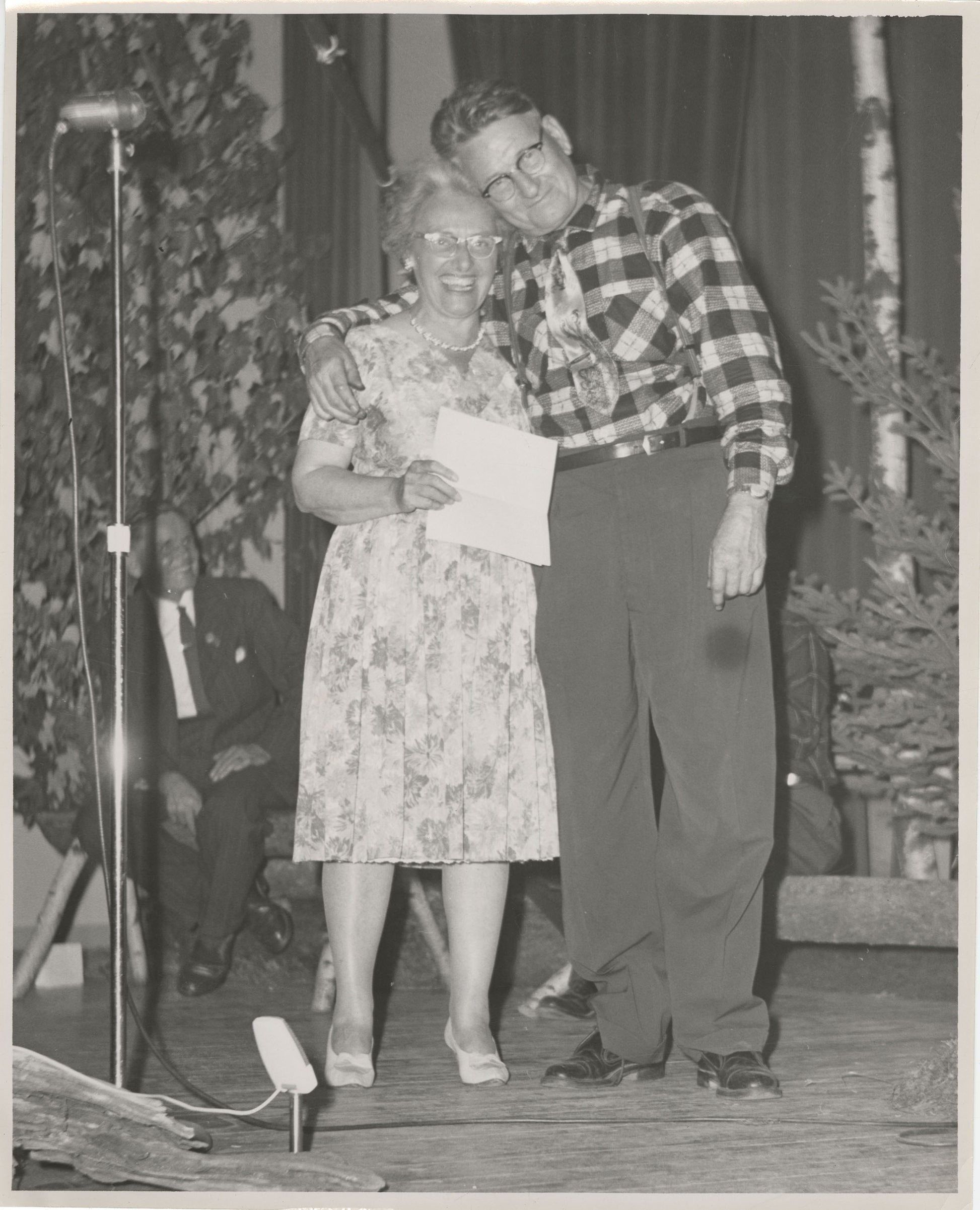 Wilmot MacDonald, with judge Helen Creighton at end of Miramichi Folk Song Festival. Sam Jegoe seated