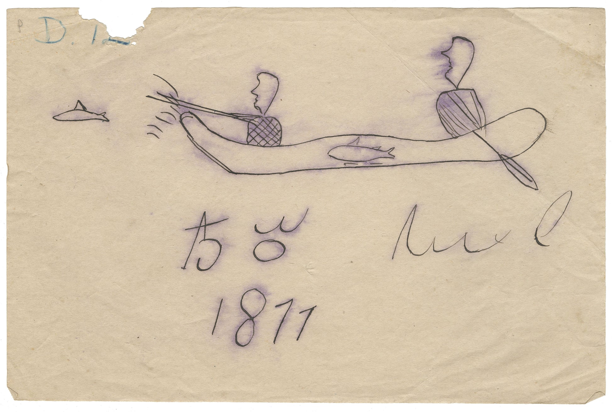Petroglyph tracings D: Canoes #12. 3 negatives and 1 positive. The canoe with raised, rounded center gunwale is the typical "humpback" of the Mi'kmaqs. The fish etched into the side of the canoe may be a personal for family totem or may have been used to attract fish. Also contains date 1877 and Mi'kmaq hieroglyphic writings. Possible interpretation of petroglyph from Rock Drawings of the Micmac Indians.