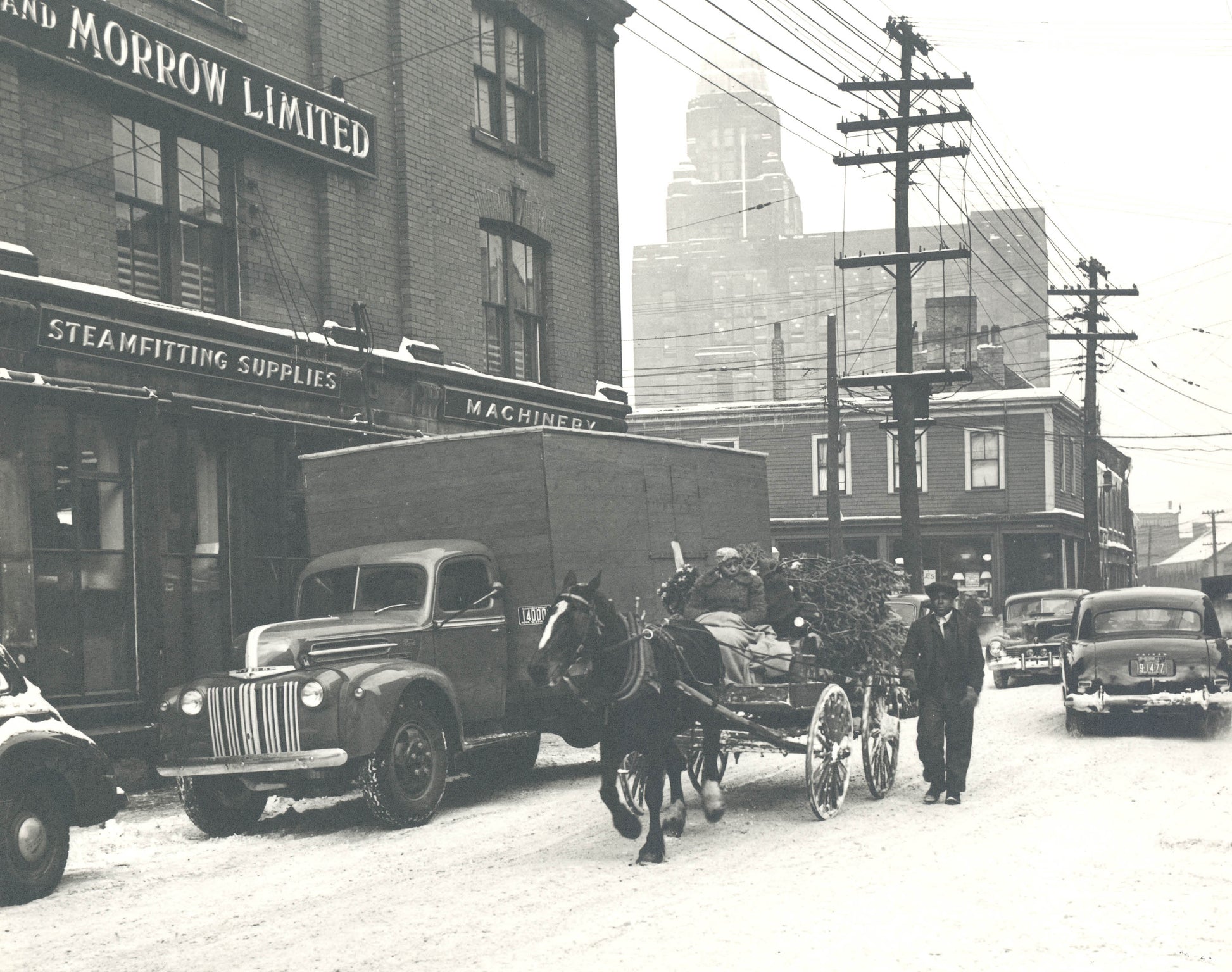 The couple in the foreground are bringing Christmas trees for sale.